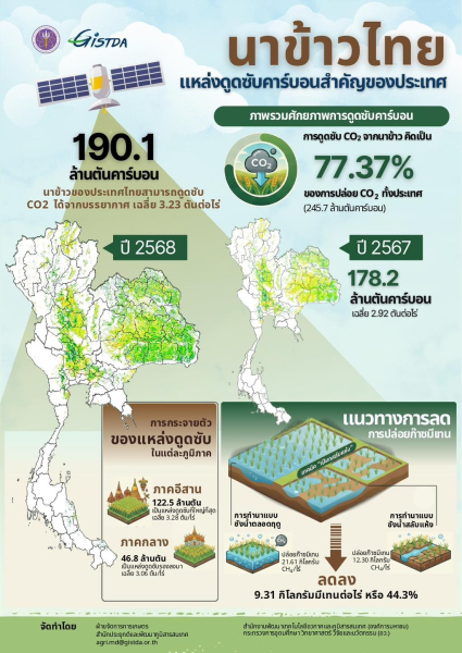 ปี 2568  190.1 ล้านตันคาร์บอน นาข้าวของประเทศไทยสามารถดูดซับ CO2 ได้จากบรรยากาศ เฉลี่ย 3.23 ตันต่อไร่