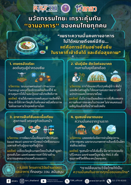 นวัตกรรมไทย: เกราะคุ้มกัน "จานอาหาร" ของคนไทยทุกคน กองทุนส่งเสริมวิทยาศาสตร์ วิจัยและนวัตกรรม (ววน.) โดยสำนักงานคณะกรรมการส่งเสริมวิทยาศาสตร์ วิจัยและนวัตกรรม (สกสว.) มุ่งมั่นขับเคลื่อนงานวิจัยและนวัตกรรมด้านความมั่นคงทางอาหาร ผ่านการสนับสนุนมากกว่า 8,000 โครงการวิจัยด้านอาหาร เพื่อสร้างหลักประกันว่าคนไทยทุกคนจะมีอาหารที่เพียงพอ ปลอดภัย และเข้าถึงได้