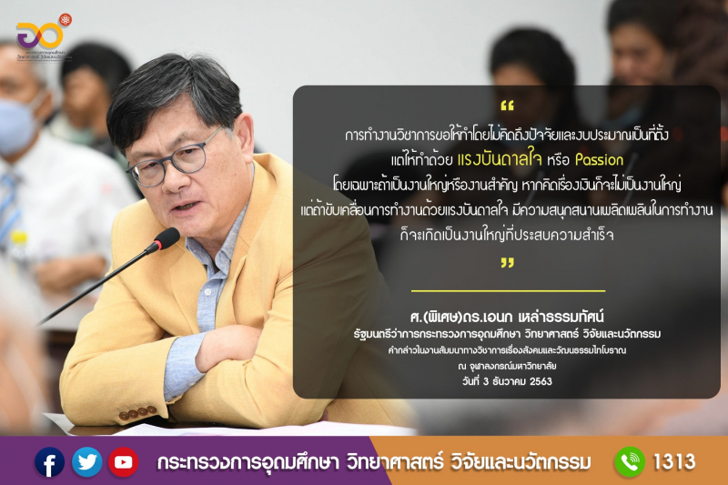 "การทำงานวิชาการขอให้ทำโดยไม่คิดถึงปัจจัยและงบประมาณเป็นที่ตั้ง แต่ให้ทำด้วย แรงบันดาลใจ หรือ Passion โดยเฉพาะถ้าเป็นงานใหญ่หรืองานสำคัญ หากคิดเรื่องเงินก็จะไม่เป็นงานใหญ่ แต่ถ้าขับเคลื่อนการทำงานด้วยแรงบันดาลใจ มีความสนุกสนานเพลิดเพลินในการทำงานก็จะเกิดเป็นงานใหญ่ที่ประสบความสำเร็จ"