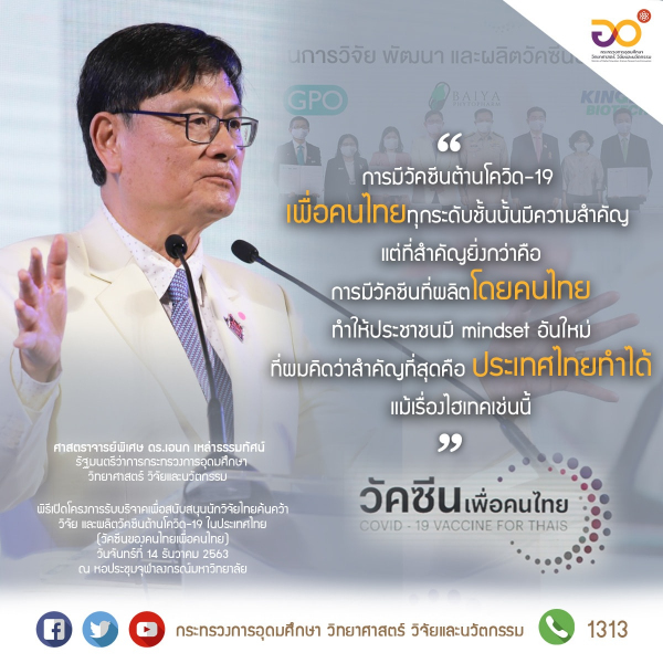 " การมีวัคซีนต้านโควิด-19 เพื่อคนไทยทุกระดับชั้นนั้นมีความสำคัญ แต่ที่สำคัญยิ่งกว่าคือ การมีวัคซีนที่ผลิตโดยคนไทย ทำให้ประชาชนมี mindset อันใหม่ที่ผมคิดว่าสำคัญที่สุดคือ ประเทศไทยทำได้ แม้เรื่องไฮเทคเช่นนี้ "