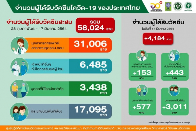 ? จำนวนผู้ได้รับวัคซีนสะสม 28 กุมภาพันธ์ – 17 มีนาคม 2564 รวม 58,024 ราย