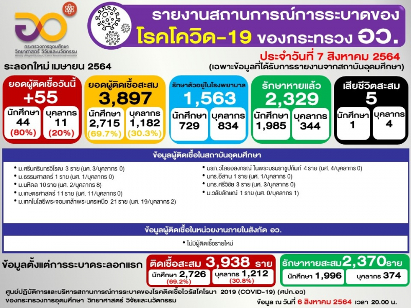 ข้อมูล : ศูนย์ปฏิบัติการและบริหารสถานการณ์การระบาดของโรคติดเชื้อไวรัสโคโรนา 2019 (COVID-19) (ศปก.อว.)