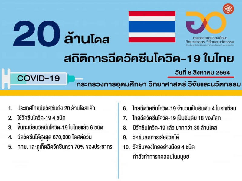 (8 สิงหาคม 2564) ศาสตราจารย์ ดร. นายแพทย์ สิริฤกษ์ ทรงศิวิไล ปลัดกระทรวงการอุดมศึกษา วิทยาศาสตร์ วิจัยและนวัตกรรม (อว.) เผยว่า ขณะนี้ประเทศไทยได้ฉีดวัคซีนโควิด-19 แล้ว เป็นจำนวนถึง 20 ล้านโดส โดยใช้เวลาเพียง 36 วันในการฉีด 10 ล้านโดสหลังนี้