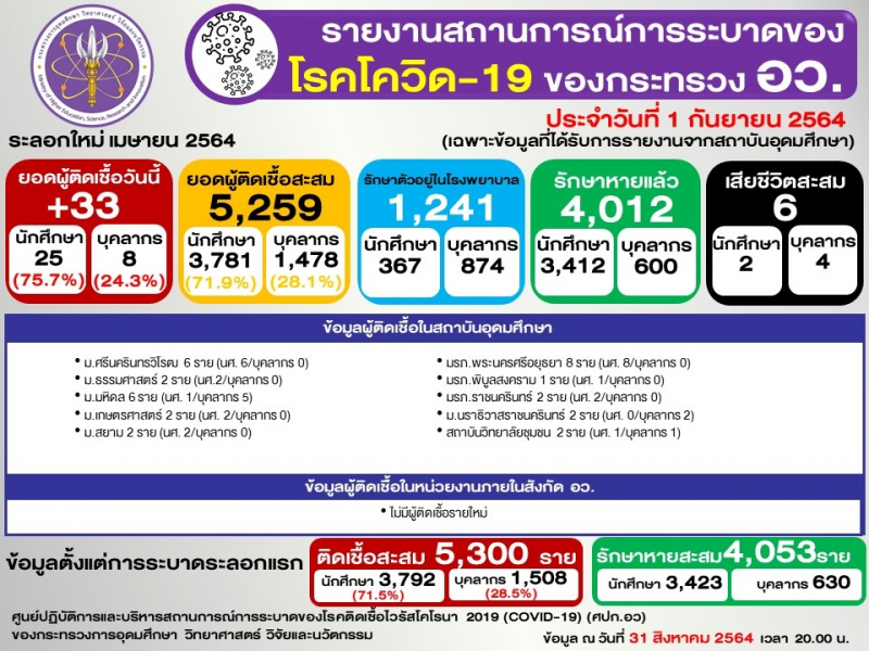 ข้อมูล : ศูนย์ปฏิบัติการและบริหารสถานการณ์การระบาดของโรคติดเชื้อไวรัสโคโรนา 2019 (COVID-19) (ศปก.อว.)