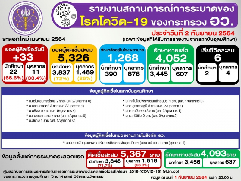 ข้อมูล : ศูนย์ปฏิบัติการและบริหารสถานการณ์การระบาดของโรคติดเชื้อไวรัสโคโรนา 2019 (COVID-19) (ศปก.อว.)