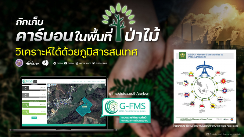 GISTDA ได้เข้ามามีบทบาทในภารกิจนี้ โดยการนำข้อมูลภาพถ่ายดาวเทียมและเทคโนโลยีภูมิสารสนเทศ มาช่วยในการติดตามพื้นที่ป่าไม้ของประเทศ และสนับสนุนการลดก๊าซเรือนกระจกภาคสมัครใจตามมาตรฐานประเทศไทย (T-VER) ทั้งนี้ได้พัฒนาแบบจำลองเชิงพื้นที่ในการประเมินการกักเก็บคาร์บอน เพื่อใช้สำหรับการประเมินคาร์บอนในพื้นที่ป่าของประเทศ หรือ พื้นที่ชุมชน หรือ พื้นที่หนึ่งพื้นที่ใดที่สนใจ โดยการคำนวณปริมาณการกักเก็บคาร์บอนในพื้นที่ป่าไม้ จะเป็นส่วนหนึ่งที่อยู่ในระบบติดตามเหตุการณ์ทางด้านป่าไม้ หรือ ระบบ G-FMS ซึ่งเป็นระบบที่เปิดให้ประชาชนทั่วไปได้ทดลองคำนวณปริมาณการกักเก็บคาร์บอนในพื้นที่ป่าไม้ของตนเอง หรือพื้นที่ที่สนใจ ในหน้าแผนที่ได้เลย ตามลิ้งค์นี้ค่ะ https://gfms.gistda.or.th/carbon ลองเข้ามาใช้งานกันได้ นอกจากนี้ระบบดังกล่าวยังเก็บรวบรวมและเกาะกระแสข่าวสารเกี่ยวกับป่าไม้ไว้ในนี้อีกด้วย สามารถเข้ามาค้นหาข้อมูลย้อนหลังกันได้ พื้นที่สีเขียวภายในประเทศจะเพิ่มขึ้นถ้าทุกคนช่วยกัน รักสีเขียว รักประเทศไทยย