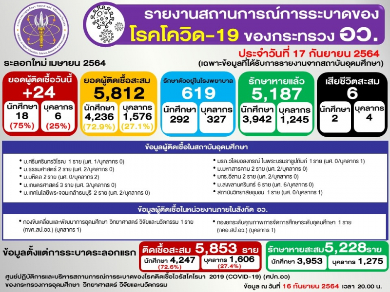 ข้อมูล : ศูนย์ปฏิบัติการและบริหารสถานการณ์การระบาดของโรคติดเชื้อไวรัสโคโรนา 2019 (COVID-19) (ศปก.อว.)