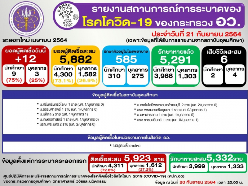 ข้อมูล : ศูนย์ปฏิบัติการและบริหารสถานการณ์การระบาดของโรคติดเชื้อไวรัสโคโรนา 2019 (COVID-19) (ศปก.อว.)
