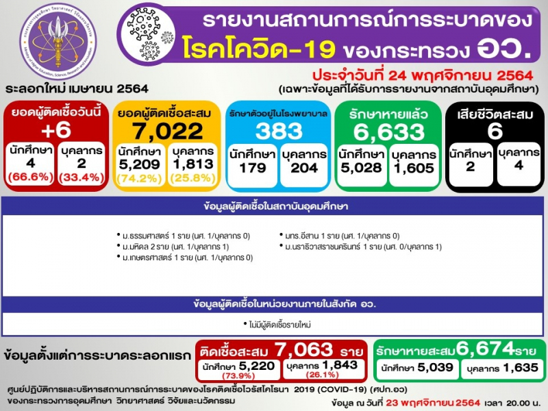 ข้อมูล : ศูนย์ปฏิบัติการและบริหารสถานการณ์การระบาดของโรคติดเชื้อไวรัสโคโรนา 2019 (COVID-19) (ศปก.อว.)