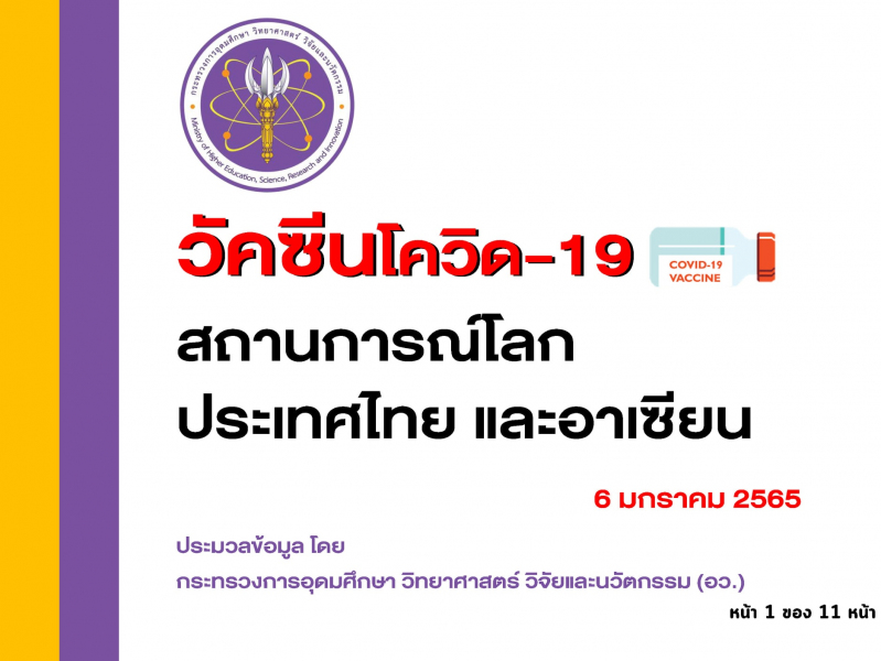 "อว. เผยฉีดวัคซีนของไทย ณ วันที่ 6 มกราคม 2565 ฉีดวัคซีนแล้ว 104,544,852 โดส และทั่วโลกแล้ว 9,292 ล้านโดส สถานการณ์ รพ.สนามรวมศูนย์แยกกักชุมชน ของ อว. (6 มกราคม 2565 )