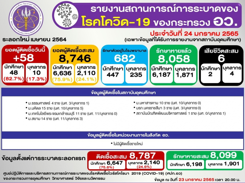 ข้อมูล : ศูนย์ปฏิบัติการและบริหารสถานการณ์การระบาดของโรคติดเชื้อไวรัสโคโรนา 2019 (COVID-19) (ศปก.อว.)