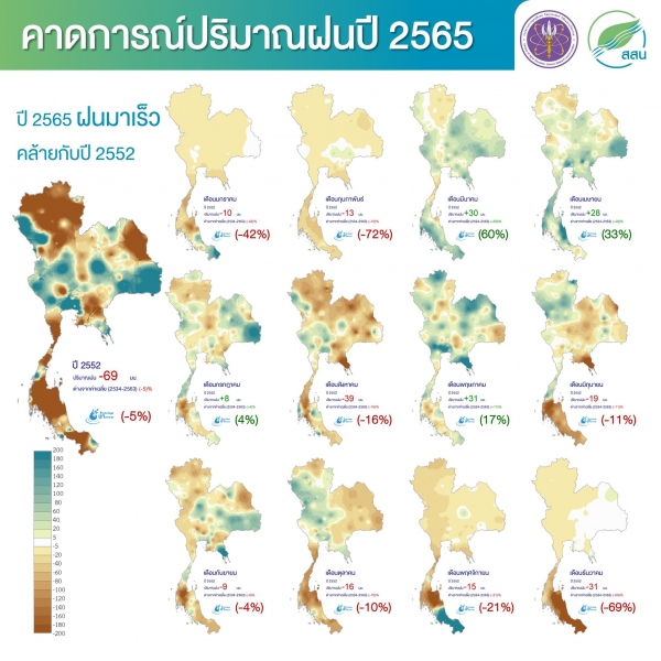 สอดคล้องกับการคาดการณ์ของสถาบันสารสนเทศทรัพยากรน้ำ (องค์การมหาชน) หรือ สสน. ที่พบว่า ลักษณะการกระจายตัวของฝนรายเดือนของประเทศ ในปี 2565 มีความคล้ายคลึงกับปี 2552 ที่จะมีฝนตกเร็ว จากพายุฤดูร้อนเกิดขึ้นบ่อยครั้ง