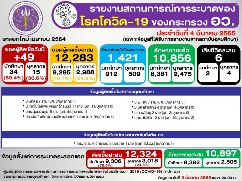 ข้อมูล : ศูนย์ปฏิบัติการและบริหารสถานการณ์การระบาดของโรคติดเชื้อไวรัสโคโรนา 2019 (COVID-19) (ศปก.อว.)