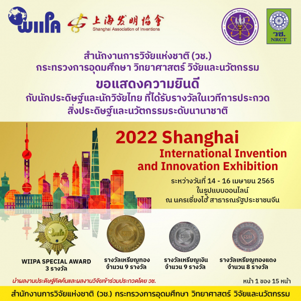 ดร.วิภารัตน์ ดีอ่อง ผู้อำนวยการสำนักงานการวิจัยแห่งชาติ เปิดเผยว่า ด้วยความร่วมมือกับหน่วยงานเครือข่ายพันธมิตร สำนักงานการวิจัยแห่งชาติ (วช.) กระทรวงการอุดมศึกษา วิทยาศาสตร์ วิจัยและนวัตกรรม นำคณะนักประดิษฐ์/นักวิจัยไทยจาก 13 หน่วยงานคว้ารางวัลระดับนานาชาติจากงาน “2022 Shanghai International Invention and Innovation Exhibition” กำหนดจัดขึ้นระหว่างวันที่ 14 - 16 เมษายน 2565 ณ นครเซี่ยงไฮ้ สาธารณรัฐประชาชนจีน ซึ่งเป็นการประกวดและนำเสนอผลงานในรูปแบบออนไลน์ โดยในปีนี้จัดขึ้นเป็นครั้งที่ 6 โดย World Invention Intellectual Property Associations (WIIPA) หน่วยงานนานาชาติด้านการส่งเสริมสิ่งประดิษฐ์และนวัตกรรมแห่งไต้หวัน โดยมีนักวิจัย/นักประดิษฐ์จากนานาประเทศนำผลงานเข้าร่วมประกวดและจัดแสดงในงานดังกล่าว