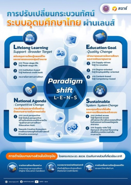 ? จากเหตุผลดังกล่าว ระบบอุดมศึกษาของไทย จึงมีความจำเป็นต้องปรับเปลี่ยนกระบวนทัศน์ หรือ Paradigm shift ใน 4 ด้าน ผ่านเลนส์ (L-E-N-S) ซึ่งประกอบด้วย