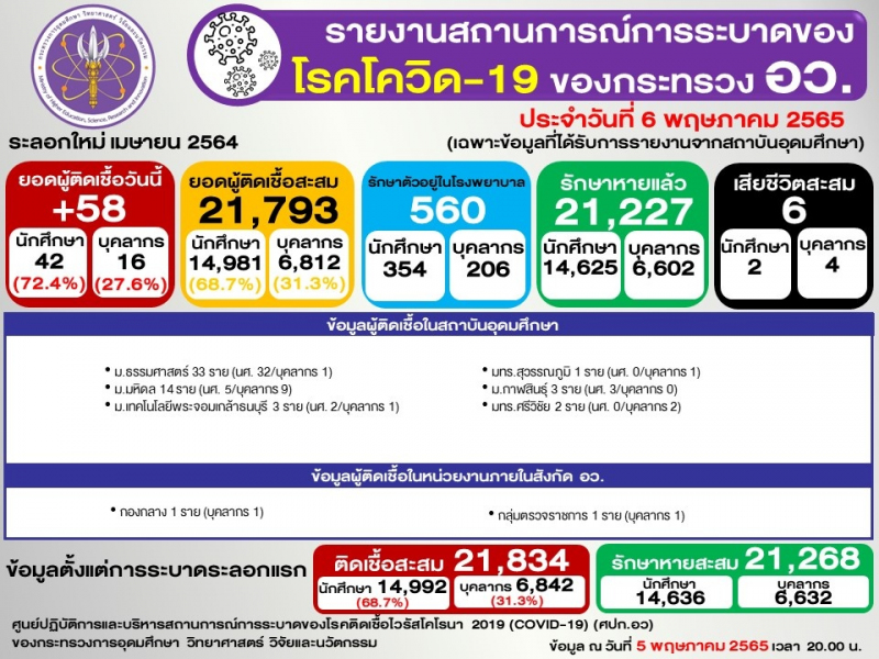 ข้อมูล : ศูนย์ปฏิบัติการและบริหารสถานการณ์การระบาดของโรคติดเชื้อไวรัสโคโรนา 2019 (COVID-19) (ศปก.อว.)