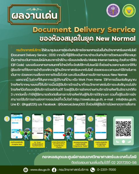 Document Delivery Service ของห้องสมุดในยุค New Normal กองหอสมุดฯ ได้พัฒนารูปแบบการชำระเงินค่าบริการจัดหาเอกสารฉบับเต็มด้านวิทยาศาสตร์และเทคโนโลยี (Document Delivery Service ; DDS) จากเดิมที่ผู้ใช้ต้องเดินทางมาชำระเงินค่าบริการด้วยตนเองที่ห้องสมุดเป็นการชำระเงินทางออนไลน์ผ่านธนาคารใกล้บ้าน หรือแอปพลิเคชัน Mobile Internet banking ด้วยคิวอาร์โค้ด (QR Code) และรอรับเอกสารสารสนเทศที่เจ้าหน้าที่จะจัดส่งให้ทางไปรษณีย์ ซึ่งช่วยอำนวยความสะดวกให้กับผู้รับบริการที่ต้องการเข้าถึงองค์ความรู้ด้านวิทยาศาสตร์และเทคโนโลยี ช่วยลดระยะเวลาและค่าใช้จ่ายในการเดินทาง ช่วยลดความเสี่ยงจากการติดเชื้อไวรัส และปรับเปลี่ยนการบริการตามแบบ New Normal