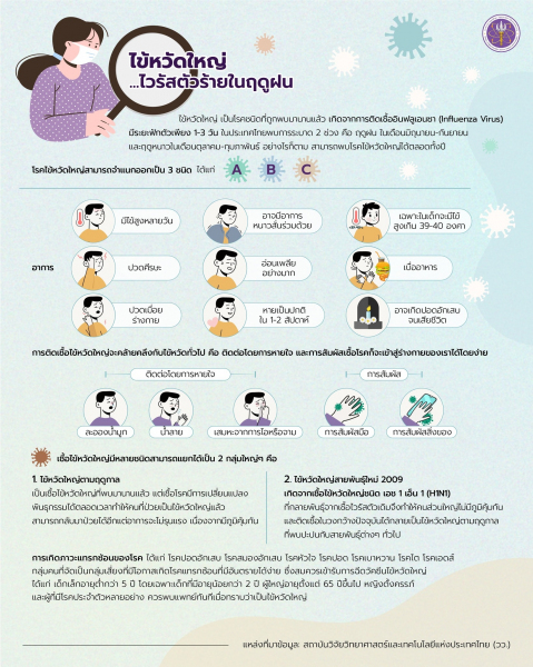 "ไข้หวัดใหญ่" เป็นโรคชนิดนี้ถูกพบมานานแล้ว เกิดจากการติดเชื้ออินฟลูเอนซา (Influenza Virus) มีระยะฟักตัวเพียง 1-3 วัน ในประเทศไทยพบการระบาด 2 ช่วง คือ ฤดูฝน ในเดือนมิถุนายน-กันยายน และฤดูหนาวในเดือนตุลาคม-กุมภาพันธ์ อย่างไรก็ตาม สามารถพบโรคไข้หวัดใหญ่ได้ตลอดทั้งปี