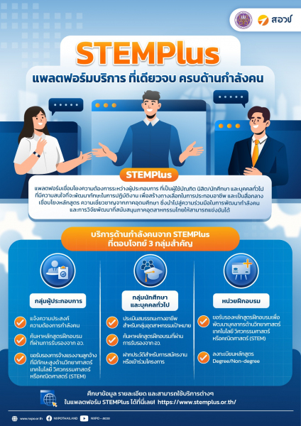ให้ทุกเรื่องเกี่ยวกับการพัฒนากำลังคนกลายเป็นเรื่องง่าย เพราะแพลตฟอร์ม STEMPlus โดยความร่วมมือระหว่าง สำนักงานปลัด กระทรวง อว. และ สอวช. รวบรวมทุกอย่างที่จำเป็นในเรื่องกำลังคนไว้ในที่เดียว เพื่อปลดล็อกข้อจำกัดด้านกำลังคนให้ภาคอุตสาหกรรมของไทยเติบโตไปข้างหน้าได้อย่างยั่งยืน