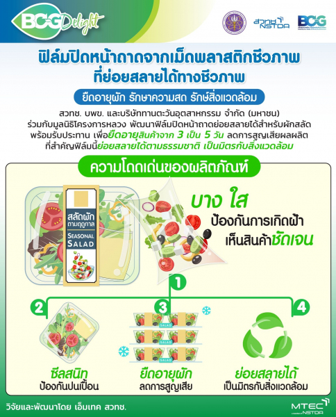 ศูนย์เทคโนโลยีโลหะและวัสดุแห่งชาติ (เอ็มเทค) สำนักงานพัฒนาวิทยาศาสตร์และเทคโนโลยีแห่งชาติ (สวทช.) ร่วมกับมูลนิธิโครงการหลวง และบริษัททานตะวันอุตสาหกรรม จำกัด (มหาชน) พัฒนาฟิล์มปิดหน้าถาดจากเม็ดพลาสติกชีวภาพที่ย่อยสลายได้ทางชีวภาพ