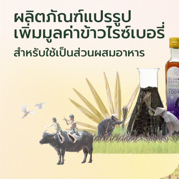 ผลิตภัณฑ์น้ำส้มสายชูหมักจากข้าวไรซ์เบอร์รี่ 100% ผลิตจากข้าวไรซ์เบอรี่หมักด้วยหัวเชื้ออย่างดี จาก ศูนย์ความหลากหลายทางชีวภาพ วว. ผลิตภัณฑ์มีสีม่วงอมแดง มีกลิ่นหอมของข้าวไรซ์เบอร์รี่ มีปริมาณกรดน้ำส้มมาตรฐาน 4.0-5.0% มีวิตามินบี ปริมาณไขมัน และคอเลสเตอรอล 0%