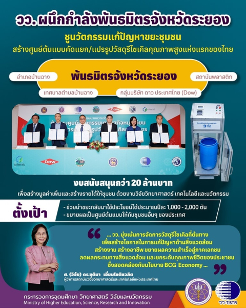 “...วว. มุ่งเน้นการจัดการวัสดุรีไซเคิลที่ต้นทาง เพื่อสร้างโอกาสในการแก้ปัญหาด้านสิ่งแวดล้อม สร้างงาน สร้างอาชีพ ขยายผลความสำเร็จสู่ภาคเอกชน ลดผลกระทบทางสิ่งแวดล้อม และยกระดับคุณภาพชีวิตของประชาชน ซึ่งสอดคล้องกับนโยบาย BCG Economy เชื่อมั่นว่าความร่วมมือเชิงบูรณาการของ วว. และพันธมิตรในครั้งนี้ จะช่วยเสริมสร้างความเข้มแข็งในการนำผลงานวิจัยและพัฒนาทางวิทยาศาสตร์เทคโนโลยีและนวัตกรรม สู่การสร้างต้นแบบศูนย์นวัตกรรมเศรษฐกิจหมุนเวียนเพื่อจัดการและแปรรูปวัสดุรีไซเคิลครบวงจร อันจะนำไปสู่การขับเคลื่อนนวัตกรรมจากงานวิจัยสู่การประยุกต์ใช้งานจริง ทำให้เกิดประโยชน์ต่อสิ่งแวดล้อมและชุมชน เกิดการพัฒนาประเทศที่ยั่งยืนและเป็นรากฐานที่เข้มแข็งในการพัฒนาประเทศต่อไป...”