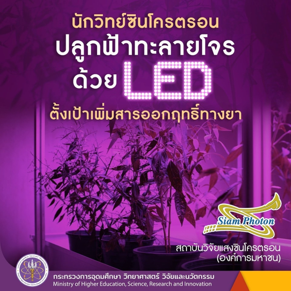 นักวิทยาศาสตร์ระบบลำเลียงแสงของ สถาบันวิจัยแสงซินโครตรอน(องค์การมหาชน) SLRI กระทรวงการอุดมศึกษา วิทยาศาสตร์ วิจัยและนวัตกรรม (อว.) ศึกษาการปลูกฟ้าทะลายโจรด้วยแสง LED ตั้งเป้าช่วยเกษตรกรปรับปรุงการปลูกเพื่อเพิ่มสารออกฤทธิ์ทางยา พร้อมใช้แสงซินโครตรอนวิเคราะห์ได้ผลการปลูกด้วยแสงสีแดงให้สารสำคัญมากกว่าการปลูกด้วยแสงแดดประมาณ 2 เท่า