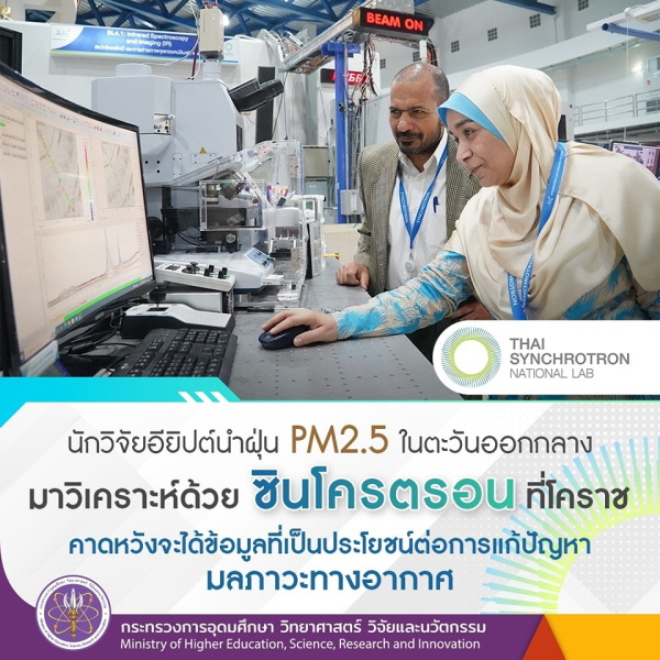 นักวิจัยอียิปต์นำฝุ่น PM2.5 ในตะวันออกกลางและกรุงไคโรมาวิเคราะห์ด้วยแสงซินโครตรอนจากเครื่องกำเนิดในโคราช เพื่อทำความเข้าใจลักษณะเฉพาะของฝุ่นและโมเลกุลต่างๆ ที่ประกอบอยู่ในอนุภาคฝุ่น คาดหวังจะได้ข้อมูลที่เป็นประโยชน์ต่อการแก้ปัญหามลภาวะทางอากาศ