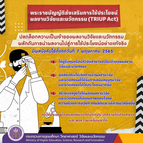 เพื่อสร้างการเปลี่ยนแปลงและยกระดับคุณภาพชีวิตของประชาชน รวมทั้งเพิ่มขีดความสามารถทางการแข่งขันของประเทศอย่างก้าวกระโดด อว. จึงได้ผลักดันพระราชบัญญัติส่งเสริมการใช้ประโยชน์ผลงานวิจัยและนวัตกรรม พ.ศ. 2564 (Thailand Research and Innovation Utilization Promotion Act; TRIUP Act) โดยมีผลบังคับใช้ตั้งแต่วันที่ 7 พฤษภาคม 2565 เป็นหนึ่งในกฎหมายเพื่อการปฏิรูปเศรษฐกิจของประเทศ ที่มีเจตนารมณ์ให้ผู้รับทุนหรือนักวิจัยสามารถเป็นเจ้าของผลงานวิจัยและนวัตกรรม มุ่งส่งเสริมให้เกิดการนำผลงานวิจัยและนวัตกรรมที่ได้รับการสนับสนุนทุนวิจัยและนวัตกรรมของรัฐไปใช้ประโยชน์มากขึ้น รวมทั้งสร้างแรงจูงใจให้สถาบันวิจัยและนักวิจัย ผลิตผลงานวิจัยและนวัตกรรมที่มีคุณภาพให้ตอบโจทย์ความต้องการของภาคผลิตและบริการมากยิ่งขึ้น ที่จะทำให้ประเทศไทยหลุดพ้นจากกับดักประเทศรายได้ปานกลาง และลดความเหลื่อมล้ำได้
