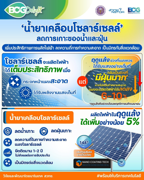 ศูนย์นาโนเทคโนโลยีแห่งชาติ (นาโนเทค) สำนักงานพัฒนาวิทยาศาสตร์และเทคโนโลยีแห่งชาติ (สวทช.) วิจัยและพัฒนา ‘น้ำยาเคลือบพื้นผิวโซลาร์เซลล์สำหรับใช้ลดการเกาะของน้ำและฝุ่น’ ที่มีคุณสมบัติปรับค่ามุมสัมของน้ำบนวัสดุ ช่วยลดการเกาะของน้ำและฝุ่น ลดความถี่ในการทำความสะอาดแผงโซลาร์เซลล์ได้เป็นอย่างดี ได้ผลิตภัณฑ์สามารถยึดติดหน้าแผงได้นาน 1-2 ปี โดยไม่ส่งผลต่อการรับประกัน ผลิตภัณฑ์ผ่านการทดสอบแล้วว่าไม่เป็นอันตรายต่อสุขภาพของผู้ใช้งานและมีความเป็นมิตรกับสิ่งแวดล้อม จากการให้บริการเคลือบพื้นผิวแผงโซลาร์เซลล์แก่โรงงานอุตสาหกรรมประเภทอาหาร วัสดุก่อสร้าง และปิโตรเลียม ที่ผ่านมา พบว่าช่วยลดความถี่ในการทำความสะอาดแผงได้เป็นอย่างดี (ความถี่ในการทำความสะอาดขึ้นอยู่กับสภาพแวดล้อมของที่ตั้งแผง)