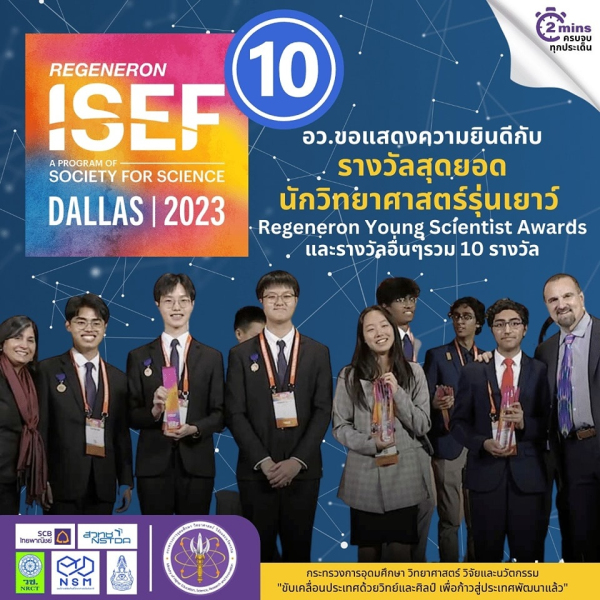 อว.ขอแสดงความยินดี และ ชื่นชมเยาวชนไทย ที่คว้าชัยในเวทีการแข่งขันประกวดโครงงานวิทยาศาสตร์ระดับโลก REGENERON ISEF 2023 และพร้อมสนับสนุนเพื่อเตรียมความพร้อมนักวิทยาศาสตร์ไทยสู่ระดับโลก