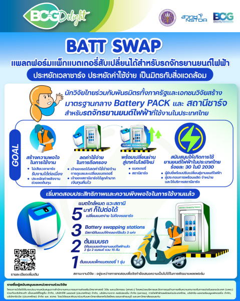 นักวิจัยไทยร่วมกับพันธมิตรภาครัฐและเอกชนวิจัยสร้างมาตรฐานกลาง Battery PACK และ สถานีชาร์จ สำหรับรถจักรยานยนต์ไฟฟ้าที่ใช้งานในประเทศไทย โดยมุ่งเป้าใน 3 ด้านหลัก ด้านแรกคือการสร้างความพึงพอใจในการใช้งานให้แก่ผู้ที่ใช้รถจัยรยานยนต์ในการประกอบอาชีพหรือใช้เพื่อการเดินทางในชีวิตประจำวัน ทั้งด้านการสับเปลี่ยนแบตได้รวดเร็วภายใน 5 นาที ไม่ต้องรอชาร์จ และการช่วยลดค่าใช้จ่ายด้านการดูแลและเปลี่ยนแบตเตอรี่ลูกใหม่ตามอายุการใช้งาน ด้านที่สองคือการช่วยลดค่าใช้จ่ายในการถือครองให้แก่ผู้ประกอบการที่ลงทุนให้บริการสถานีชาร์จ เพราะการที่แบตเตอรี่และสถานีชาร์จมีรูปแบบที่เป็นมาตรฐานกลาง ใช้ร่วมกันได้หลายรุ่นหลายแบรนด์ จะส่งผลให้มีลูกค้ามาใช้งานที่สถานีชาร์จมากยิ่งขึ้น ทำให้การลงทุนคืนทุนไว ด้านที่สามคือความพร้อมในการเปลี่ยนผ่านสู่เทคโนโลยีใหม่ เพราะหากในประเทศไทยหรือทั่วโลกมีการพัฒนาปรับปรุงเทคโนโลยีให้มีประสิทธิภาพมากยิ่งขึ้น การให้บริการด้วยโมเดลนี้จะช่วยให้ผู้ประกอบการปรับเปลี่ยนผลิตภัณฑ์สำหรับให้บริการได้ง่าย ทั้งนี้เพื่อสนับสนุนให้เกิดการใช้ยานยนต์ไฟฟ้าในประเทศไทยร้อยละ 30 ในปี 2030