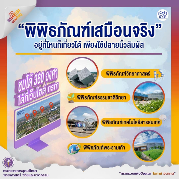 ‘MHESI ชวนไปดู’ ขอพาทุกคนไปรู้จักกับ “พิพิธภัณฑ์เสมือนจริง 360 องศา” หรือ “Virtual Museum” ขององค์การพิพิธภัณฑ์วิทยาศาสตร์แห่งชาติ (NSM) อีกหนึ่งแหล่งเรียนรู้ในกระทรวง อว. ที่จะทำให้เราสามารถเข้าชมพิพิธภัณฑ์ของ nsm ได้ทุกที่ทุกเวลา เพียงใช้แค่สมาร์ทโฟน หรือคอมพิวเตอร์เท่านั้น