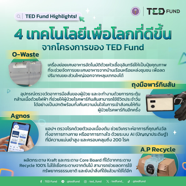 เทคโนโลยีเป็นสิ่งที่นำมาพัฒนาคุณภาพชีวิตและแก้ปัญหาที่เกิดขึ้นต่างๆ ในสังคมอย่างต่อเนื่อง TED Fund เล็งเห็นความสำคัญในส่วนนี้ จึงได้มีการสนับสนุนผู้ประกอบการอย่างต่อเนื่องผ่านโครงการ TED Youth Start Up และ TED Market Scaling Up และเนื่องในวันเทคโนโลยีของไทย TEDDY ขอพาเพื่อนๆ พี่ๆ มารู้จักกับ 4 เทคโนโลยีเพื่อโลกที่ดีขึ้นจากโครงการของ TED Fund กัน!