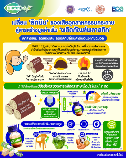 สวทช. ร่วมกับ มจธ. และพันธมิตร พัฒนาต่อยอดเทคโนโลยีเพื่อสร้างมูลค่าเพิ่มให้แก่ ‘สารลิกนิน’ ที่ได้จากกระบวนการเตรียมเยื่อกระดาษด้วยเทคนิคออร์แกโนโซลฟ์ (Organosolv process) ซึ่งเป็นกระบวนการที่ทีมวิจัยและบริษัทร่วมกันพัฒนาขึ้นก่อนหน้านี้เพื่อให้การผลิตผลิตภัณฑ์กระดาษมีความเป็นมิตรกับสิ่งแวดล้อมมากยิ่งขึ้น
