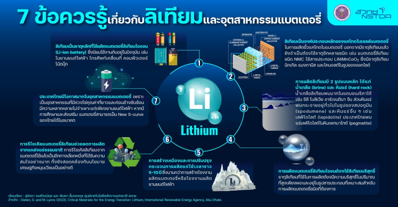 7 ข้อควรรู้เกี่ยวกับลิเทียม ธาตุหลักที่ใช้ในการผลิตแบตเตอรี่ลิเทียมไอออน (Li-ion battery) แบตฯ ที่มีการใช้งานมากทั้งในยานยนต์ไฟฟ้า โทรศัพท์เคลื่อนที่ คอมพิวเตอร์โน้ตบุ๊ก และอุปกรณ์เครื่องใช้ไฟฟ้าแบบพกพาอีกหลายชนิด รวมถึงโอกาสของประเทศไทยใน
