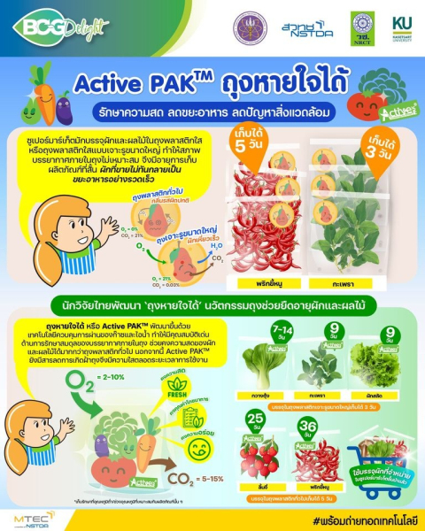 ซูเปอร์มาร์เก็ตมักบรรจุผักและผลไม้ในถุงพลาสติกใสหรือถุงพลาสติกใสแบบเจาะรูขนาดใหญ่ ทำให้สภาพบรรยากาศภายในถุงไม่เหมาะสม มีอายุการเก็บผลิตภัณฑ์สั้น ผักที่ขายไม่ทันจึงกลายเป็นขยะอาหารอย่างรวดเร็ว เพื่อแก้ปัญหาดังกล่าวนักวิจัยไทยได้พัฒนา 'ถุงหายใจได้' หรือ 'Active PAK™' ขึ้นเพื่อช่วยยืดอายุผักและผลไม้