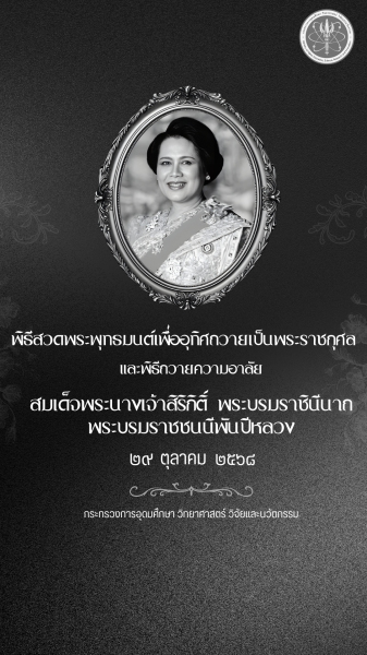 กระทรวง อว.จัดพิธีบำเพ็ญกุศลและถวายความอาลัย แด่สมเด็จพระนางเจ้าสิริกิติ์ พระบรมราชินีนาถ พระบรมราชชนนีพันปีหลวง “สุรศักดิ์” นำผู้บริหาร ข้าราชการร่วมพิธีถวายความอาลัยอย่างพร้อมเพรียง เมื่อวันที่ 29 ต.ค.ที่กระทรวงการอุดมศึกษา วิทยาศาสตร์ วิจัยและนวัตกรรม(อว.) มีการจัดพิธีบำเพ็ญกุศลสวดพระพุทธมนต์เพื่ออุทิศถวายเป็นพระราชกุศลพร้อมจัดพิธีถวายความอาลัยแด่สมเด็จพระนางเจ้าสิริกิติ์ พระบรมราชินีนาถ พระบรมราชชนนีพันปีหลวง ณ อาคารพระจอมเกล้า สป.อว. (ซอยโยธี) โดยมีนายสุรศักดิ์ พันธุ์เจริญวรกุล รัฐมนตรีว่าการกระทรวงการอุดมศึกษา วิทยาศาสตร์ วิจัยและนวัตกรรม(อว.) พร้อมด้วย ศ.ดร.ศุภชัย ปทุมนากุล ปลัดกระทรวง อว. นางสาวพิมพ์พร ชีวานนท์ เลขานุการ รมว.อว. นางสาววราภรณ์ รุ่งตระการ รองปลัดกระทรวง อว.และคณะผู้บริหาร อว.ตลอดจนหน่วยงานในสังกัด อว. ข้าราชการและเจ้าหน้าที่กระทรวง อว.เข้าร่วมอย่างพร้อมเพรียง ทั้งนี้ พิธีเริ่มตั้งแต่ช่วงเช้า มีการถวายภัตตาหารเช้าแด่พระสงฆ์ 10 รูป ต่อมานายสุรศักดิ์ เป็น ประธานจุดธูปเทียนบูชาพระรัตนตรัยและจุดเครื่องทองน้อยถวายความเคารพเบื้องหน้าพระบรมฉายาลักษณ์สมเด็จพระนางเจ้าสิริกิติ์ พระบรมราชินีนาถ พระบรมราชชนนีพันปีหลวง จากนั้นพระสงฆ์สวดเจริญพระพุทธมนต์ เสร็จสิ้นประธานในพิธีได้ทอดผ้าบังสุกุลและพระสงฆ์สดับปกรณ์ ตามด้วยการถวายจตุปัจจัยไทยธรรมและภัตตาหารเพลแด่พระสงฆ์ พระสงฆ์อนุโมทนา ประธานในพิธีกรวดน้ำ เป็นอันเสร็จสิ้นพิธีทำบุญ ต่อมานายสุรศักดิ์ ได้นำคณะผู้บริหาร ข้าราชการและเจ้าหน้าที่กระทรวง อว.ร่วมพิธีถวายความอาลัยและลงนามถวายความอาลัย ณ บริเวณด้านหน้าห้องแถลงข่าว เพื่อน้อมรำลึกในพระมหากรุณาธิคุณที่ทรงมีต่อการศึกษา วิทยาศาสตร์ และการพัฒนาประเทศชาติตลอดมา