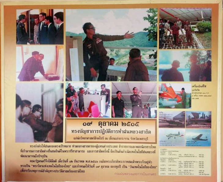 ด้วยสายพระเนตรที่ยาวไกลและพระอัจฉริยภาพด้านวิทยาศาสตร์ของ พระบาทสมเด็จพระบรมชนกาธิเบศร มหาภูมิพลอดุลยเดชมหาราช บรมนาถบพิตร จึงสังเกตวิเคราะห์ข้อมูลในขั้นต้นว่าจะทรงค้นหาวิธีทำให้เกิดฝนให้ได้เพื่อบรรเทาปัญหาความทุกข์ร้อนของประชาชนชาวไทยที่ขาดแคลนน้ำในการอุปโภค-บริโภค และการเกษตร ดังนั้น ในปี พ.ศ. 2498 จึงได้ทรงพระราชทานโครงการพระราชดำริฝนหลวง และทรงโปรดเกล้าโปรดกระหม่อมให้ ม.ร.ว.เทพฤทธิ์ เทวกุล ดำเนินการค้นคว้าทดลองปฏิบัติการฝนเทียมหรือฝนหลวง จนในที่สุดได้ค้นพ้บวิธีการทำฝนเทียมแบบใหม่ของประเทศไทยโดยเฉพาะ และในวันที่ 19 ตุลาคม พ.ศ. 2515 พระบาทสมเด็จพระบรมชนกาธิเบศร มหาภูมิพลอดุลยเดชมหาราช บรมนาถบพิตร ทรงอำนวยการสาธิตฝนเทียมสูตรใหม่ครั้งแรกของโลกด้วยพระองค์เอง ณ เขื่อนแก่นกระจาน จ.เพชรบุรี และทรงพระปรีชาสามารถทำให้ฝนตกลงตรงเป้าหมายได้อย่างแม่นยำ ท่ามกลางสายตาของคณะผู้แทนของรัฐบาลจากต่างประเทศเป็นครั้งแรก
