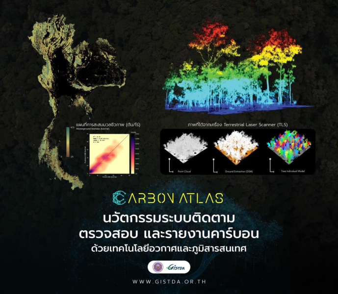 และเพื่อเป็นเวทีในการแลกเปลี่ยน เชื่อมโยงองค์ความรู้ ประสบการณ์ ความท้าทายต่าง ๆ รวมถึงนำเสนอผลงานที่เกี่ยวข้องจากหน่วยงานในทุกภาคส่วน ในการพัฒนานวัตกรรมติดตาม ตรวจสอบ และรายงานการเปลี่ยนแปลงปริมาณคาร์บอน ที่แม่นยำ ครบถ้วน ถูกต้อง และเป็นมาตรฐานที่ได้รับการยอมรับในระดับสากล GISTDA และหน่วยงานพันธมิตร ได้จัดงานสัมมนา “Carbon Atlas 2024” ขึ้น เมื่อเร็ว ๆ นี้ โดยจัดขึ้นต่อเนื่องเป็นปีที่ 2 ภายใต้แนวคิด “Satellite - Powered Carbon MRV for Climate Action” นวัตกรรมการติดตาม ตรวจสอบ และรายงาน (Monitoring, Reporting, Verification : MRV) เพื่อขับเคลื่อนประเทศไทยสู่ความเป็นกลางทางคาร์บอน และการปล่อยก๊าซเรือนกระจกสุทธิเป็นศูนย์ด้วยเทคโนโลยีอวกาศและภูมิสารสนเทศ