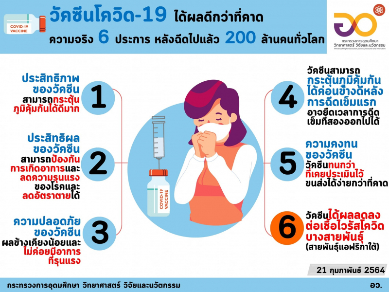 (เมื่อวันที่ 21 กุมภาพันธ์ 2564) ศาสตราจารย์ ดร. นายแพทย์สิริฤกษ์ ทรงศิวิไล ปลัดกระทรวงการอุดมศึกษา วิทยาศาสตร์ วิจัยและนวัตกรรม (อว.) เผยว่าเมื่อมีการฉีดวัคซีนโควิด-19 ทั่วโลกได้เกินกว่า 200 ล้านโดสในเวลา 2 เดือนนั้น มีการเก็บข้อมูลโดยละเอียดในมิติต่างๆ ทำให้ทราบผลการใช้งานในสถานการณ์จริงพบว่า "ประสิทธิภาพ ประสิทธิผล และความปลอดภัยของวัคซีน ดีกว่าที่คาด"