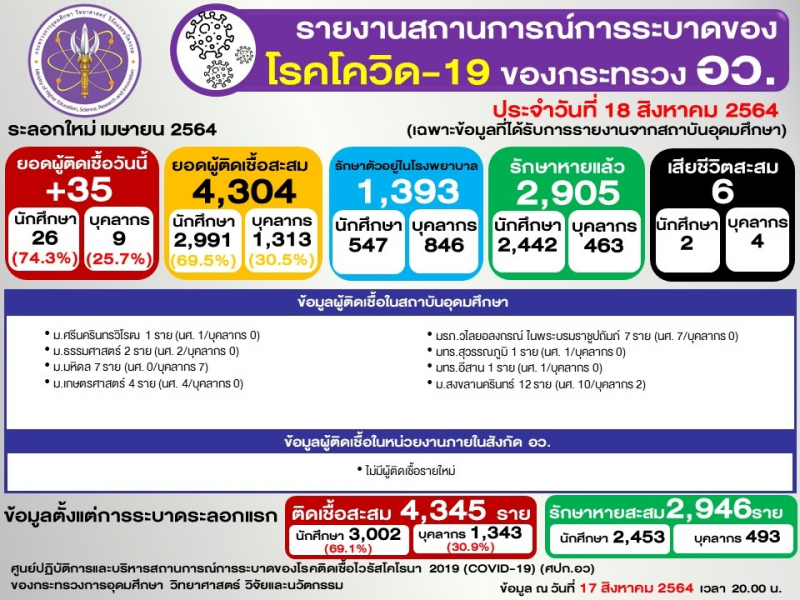 ข้อมูล : ศูนย์ปฏิบัติการและบริหารสถานการณ์การระบาดของโรคติดเชื้อไวรัสโคโรนา 2019 (COVID-19) (ศปก.อว.)