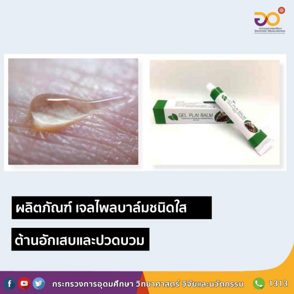 ขณะนี้ วว. ประสบผลสำเร็จในการพัฒนา GEL PLAI BALM เจลไพลบาล์มชนิดใส ชนิดควบคุมการปลดปล่อยและเพิ่มประสิทธิภาพการนำส่งสารสำคัญที่มีความเข้มข้น น้ำมันไพล ร้อยละ 5-15 โดยน้ำหนัก และถูกกักเก็บอยู่ในอนุภาคขนาดเล็ก ทำให้มีกระบวนการควบคุมการปลดปล่อย และเพิ่มประสิทธิภาพการนำส่งสารสำคัญที่มีฤทธิ์ในการต้านอักเสบและปวดบวม ออกฤทธิ์ได้นาน 12 ชั่วโมง มีความคงตัวดี ในระยะเวลา 6 เดือน โดยไม่ก่อให้เกิดความเป็นพิษ และไม่ก่อให้เกิดการระคายเคืองต่อเซลล์ผิวหนังมนุษย์ สามารถประยุกต์ใช้ในการพัฒนาผลิตภัณฑ์ทางเภสัชกรรมรวมไปถึงการขยายการผลิตในระดับอุตสาหกรรมต่อไป