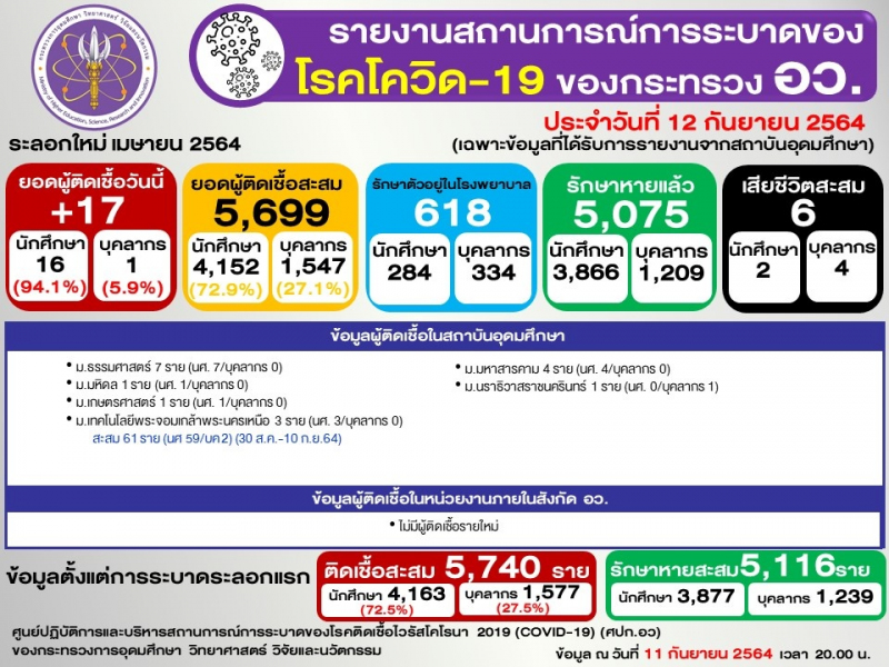 ข้อมูล : ศูนย์ปฏิบัติการและบริหารสถานการณ์การระบาดของโรคติดเชื้อไวรัสโคโรนา 2019 (COVID-19) (ศปก.อว.)