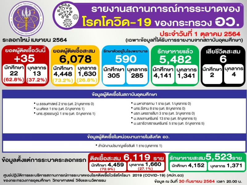 ข้อมูล : ศูนย์ปฏิบัติการและบริหารสถานการณ์การระบาดของโรคติดเชื้อไวรัสโคโรนา 2019 (COVID-19) (ศปก.อว.)