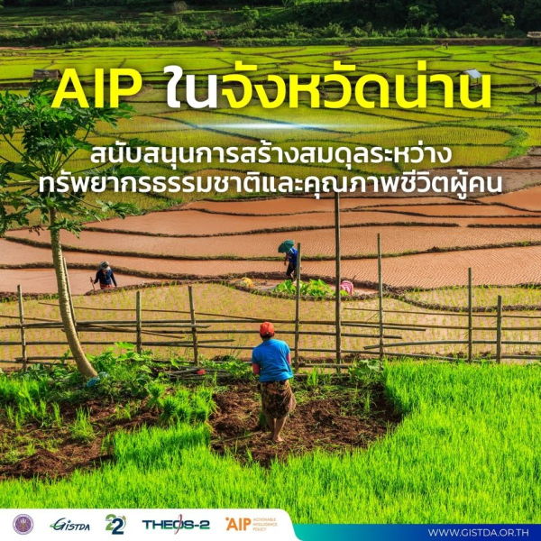 การทำงานในพื้นที่จังหวัดน่านด้วย AIP นั้น GISTDA ได้ทำงานร่วมกับหน่วยงานในจังหวัดน่านเพื่อแลกเปลี่ยนข้อมูลและร่วมกันวางแผนการทำงานในขั้นตอนต่าง ๆ ของหน่วยงานที่มีภารกิจในการดูแลพื้นที่ป่าไม้ของจังหวัดน่าน โดยใช้เทคโนโลยีภูมิสารสนเทศประเมินความสมบูรณ์ของระบบนิเวศ ชี้เป้าพื้นที่ป่าที่สูญเสียไป เมื่อพบพื้นที่เป้าหมายแล้วจึงทดลองจัดสรรพื้นที่ใหม่เพื่อให้ผู้คนยังมีพื้นที่สำหรับทำกินเพื่อการดำรงชีวิต โดยรวบรวมผลทดสอบนี้ไว้ใน AIP Dashboard เพื่อให้หน่วยงานที่เกี่ยวข้องอย่างเช่น กรมทรัพยากรธรรมชาติและสิ่งแวดล้อม ศูนย์ป่าไม้จังหวัดน่าน ร่วมกันวิเคราะห์เพื่อร่วมกันหาข้อสรุปและแนวทางปฏิบัติที่เหมาะสมสำหรับดำเนินการฟื้นฟูพื้นที่ป่าต้นน้ำต่อไป
