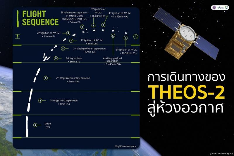 ดาวเทียม THEOS-2 จะถูกปล่อยเป็นชุดแรกหลังเร่งเครื่องไปได้ 2 ครั้ง โดยจะมีดาวเทียม FORMOSAT-7R/TRITON ของไต้หวัน ซึ่งจะถูกปล่อยออกไปพร้อมกัน ณ นาทีที่ 54 นาที 22 วินาที หลังจากถูกส่งออกจากฐานปล่อยจรวด และในที่สุด ดาวเทียม THEOS-2 อีกหนึ่งความภาคภูมิใจของคนไทยก็จะโคจรในห้วงอวกาศอย่างสมบูรณ์แบบและพร้อมปฏิบัติภารกิจที่ได้วางแผนไว้ในอนาคตอีกหลายปี เพื่อนำคุณค่าจากอวกาศสู่สังคมไทยต่อไป