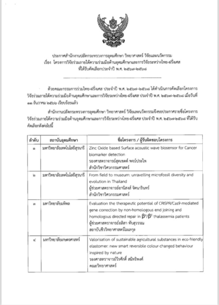 ประกาศสำนักงานปลัดกระทรวงการอุดมศึกษา วิทยาศาสตร์ วิจัยและนวัตกรรม เรื่อง โครงการวิจัยร่วมภายใต้ความร่วมมือด้านอุดมศึกษาและการวิจัยระหว่างไทย-ฝรั่งเศส ที่ได้รับคัดเลือกประจำปี พ.ศ. ๒๕๖๗–๒๕๖๘
