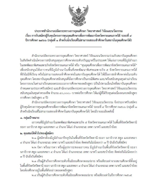 รับสมัครผู้รับทุนโครงการทุนอุดมศึกษาเพื่อการพัฒนาจังหวัด ชายแดนภาคใต้ ระยะที่ 4 ปีการศึกษา 2566 (กลุ่มที่ 1 สำหรับนักเรียนที่ไม่สามารถสอบเข้าศึกษา ในสถาบันอุดมศึกษาได้) ประจำปีการศึกษา 2566