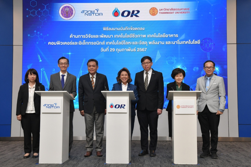 เมื่อวันที่ 29 ก.พ. กระทรวงการอุดมศึกษา วิทยาศาสตร์ วิจัยและนวัตกรรม (อว.) โดยสำนักงานพัฒนาวิทยาศาสตร์และเทคโนโลยีแห่งชาติ (สวทช.) และมหาวิทยาลัยธรรมศาสตร์ (มธ.) ลงนามความร่วมมือกับ บริษัท ปตท. น้ำมันและการค้าปลีก จำกัด (มหาชน) (OR) เพื่อร่วมกันวิจัยและพัฒนาเทคโนโลยีพลังงานทดแทนและนวัตกรรมสู่ความยั่งยืน ภายใต้สาขาเทคโนโลยีชีวภาพ เทคโนโลยีอาหาร คอมพิวเตอร์และอิเล็กทรอนิกส์ เทคโนโลยีโลหะและวัสดุ พลังงาน และนาโนเทคโนโลยี โดยมี นายเพิ่มสุข สัจจาภิวัฒน์ ปลัดกระทรวง อว. ร่วมแสดงความยินดีและเป็นสักขีพยานในการลงนาม ซึ่งนำการแถลงโดย ดร.สมบุญ สหสิทธิวัฒน์ รองผู้อำนวยการสายงานบริหารการวิจัยและพัฒนา สวทช. รศ.เกศินี วิฑูรชาติ อธิการบดีมหาวิทยาลัยธรรมศาสตร์ และนางกาญจนี อุดมกุลวณิชย์ รองประธานเจ้าหน้าที่บริหารด้านปฏิบัติการคลังปิโตรเลียม บริษัท ปตท. น้ำมันและการค้าปลีก จำกัด (มหาชน) (OR) พร้อมด้วยคณะผู้บริหารและนักวิจัยในโครงการ เข้าร่วมในงาน ณ ห้องแถลงข่าว สป.อว. (โยธี)